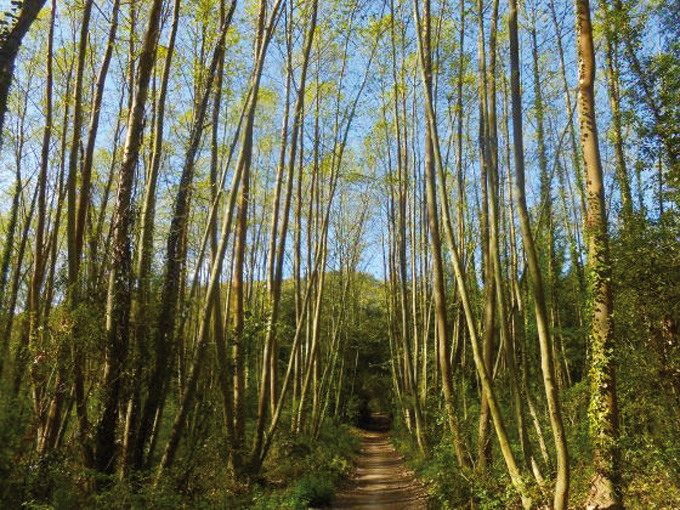 Tornem al camí principal i seguim fins a la següent cruïlla que prenem A L’ESQUERRA. Travessem la carretera asfaltada d’Olzinelles i el camí ens fa pujar una mica, fins a travessar recte una pista ampla i ens endinsem en el bosc de plataners, per un corriol ben marcat i d’una bellesa particular.