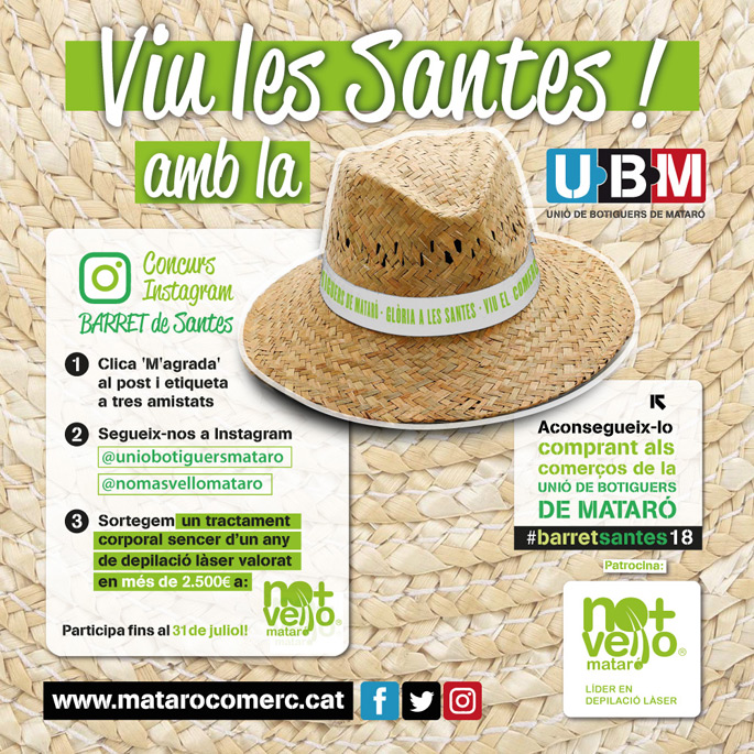 A més, aquest any s’organitza de nou un concurs d’Instagram en el que, qui vulgui podrà penjar la seva foto vivint la Festa Major de la ciutat. Per a participar hi ha temps fins el 31 de juliol i només cal etiquetar a la UBM (@uniobotiguersmataro) i a No+Vello Mataró (@nomasvellomataro), sota l’etiqueta #barretsantes18. El guanyador d’aquest concurs, que també està patrocinat per No+Vello Mataró, podrà gaudir un tractament corporal sencer d’un any de depilació làser valorat en més de 2.500 euros.